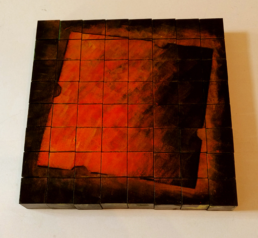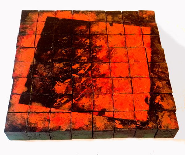 unendliches quadrat/schwarz-orange kombinatorische variante 64 würfeln je 8x8x8 cm acryl, modelpaste/storopor 2023