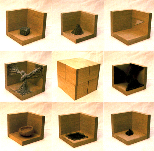 acht archetypische objekte, je 8x8 cm sand erde stein metall glass wolle leinen holz ton 2007
