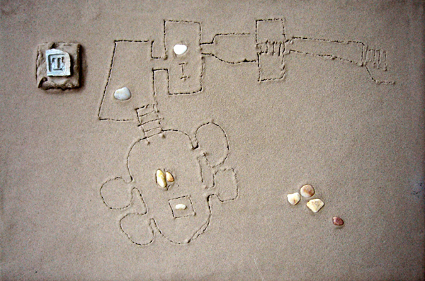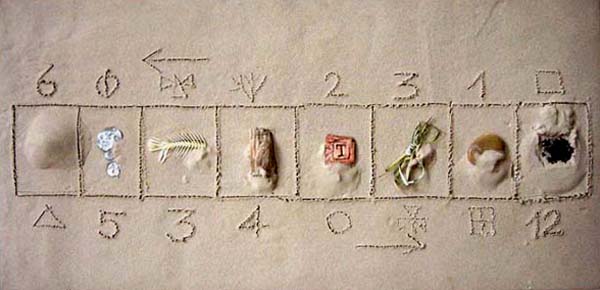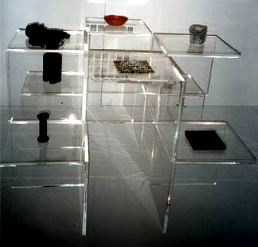 acht archetypische objekte, sand erde metall wolle leinen holz ton acrylglass 2003