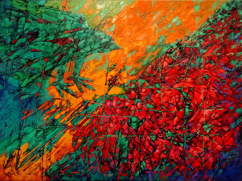 zusammenfarbspiel in archetypischen formen 200x165 cm öl/lwd.2020