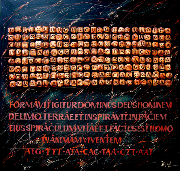 Für das Bild haben wir den genetischen Code und einen Text aus einem alten Buch benutzt: