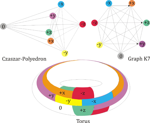 Abb. 14: Das Czaszar-Polyedron, Graph K7 und Torus.